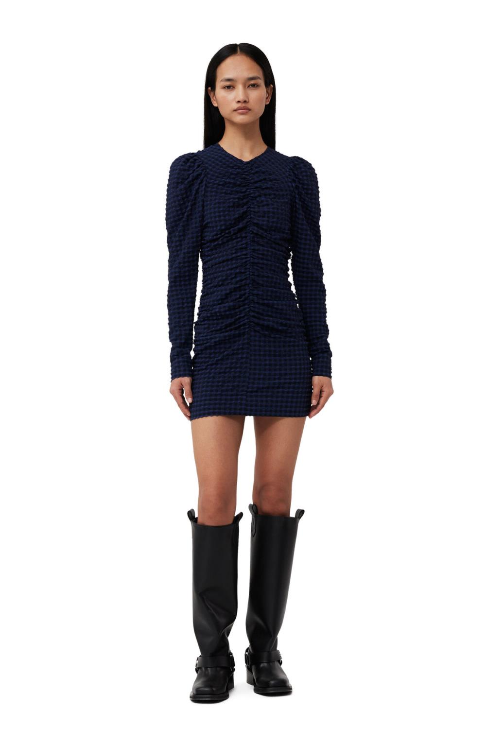 Checkered Seersucker O-Neck Mini-kjolen er laget av recycled polyester, polyamide og elastane. Kjolen er designet for en slimfit-passform og har rund hals, lange ermer, glidelåslukking bak og rysjing foran, bak og på sidene.