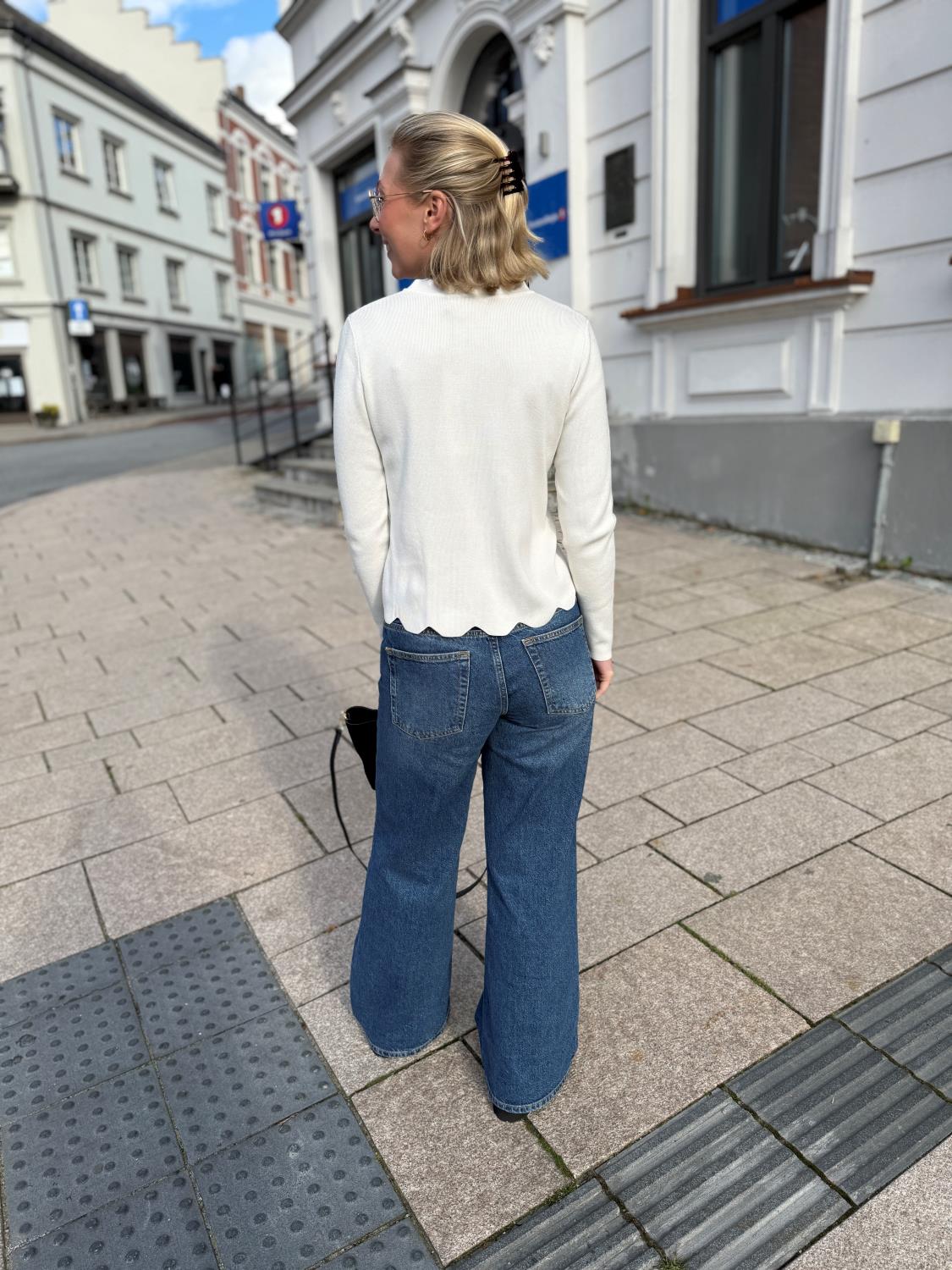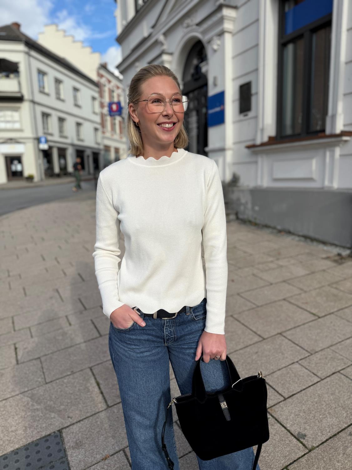 Susanna Pullover fra Alma er en genser med lange ermer, rekker til hoten og har en fin bølgete hals.