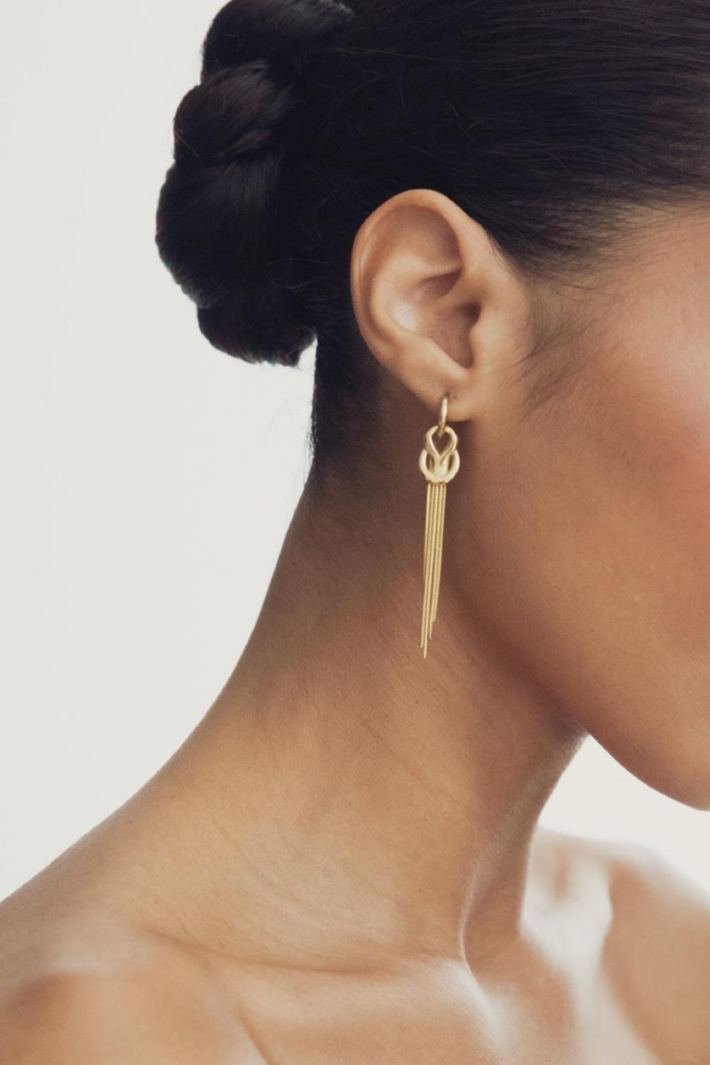 The Fringe Earrings fra Camilla Pihl er et par 4K gullbelagte (PVD) frynseøredobbene med delikate frynsedetaljer som fanger lyset ved hver bevegelse. Dristige, men elegante – dette statement-smykket tilfører et moderne preg og en naturlig sofistikasjon til enhver stil.
