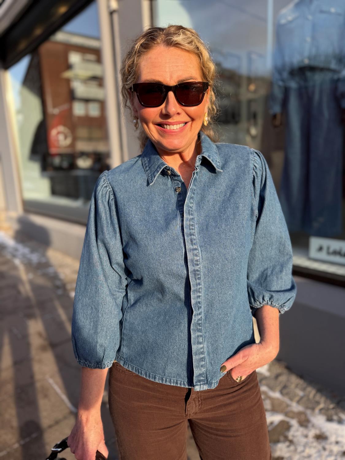 Wandana Denim Blouse fra Neo Noir er en denimbluse med pufferm og krage samt skjult knappestolpe foran. Modellen er 176 cm høy og bruker størrelse 36.