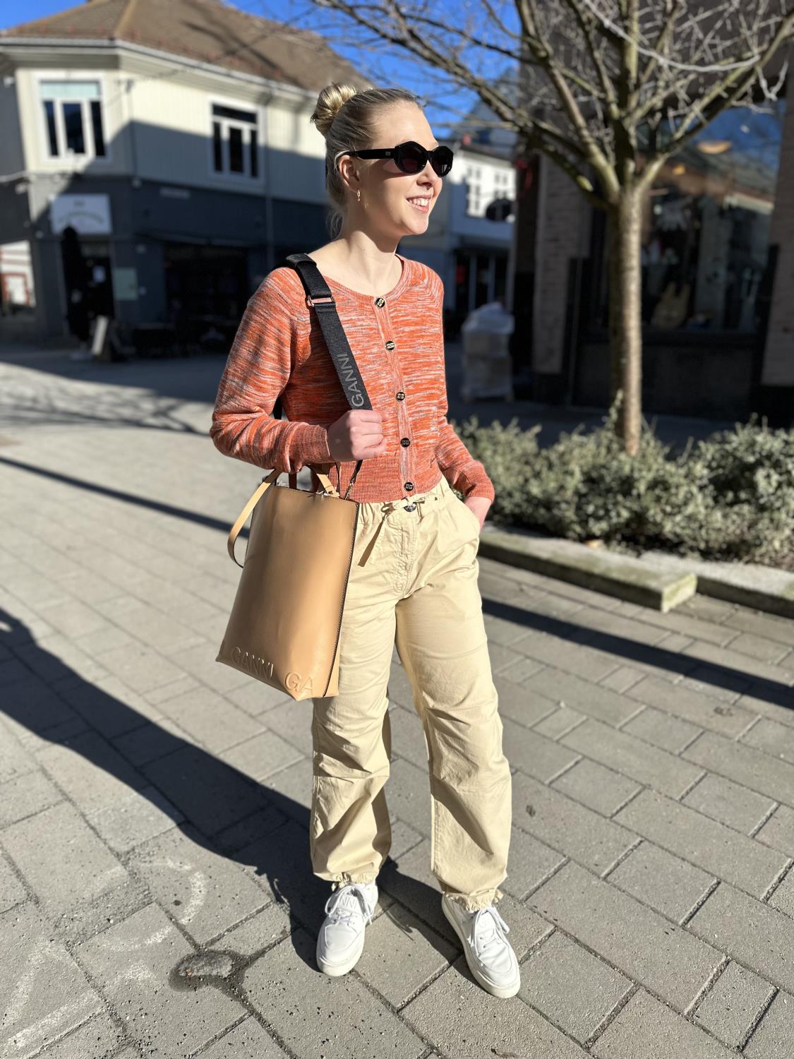 Stylet med Ganni cardigan og sneakers for et lekkert antrekk!